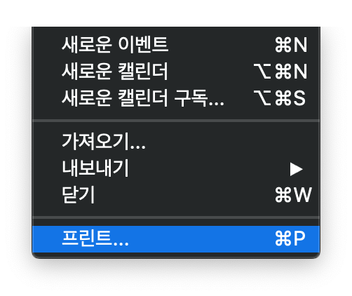 위와 같이 프린트 기능이 있다. (캘린더 앱 뿐만 아니라 거이 모든 앱이 프린트 기능이 있음)